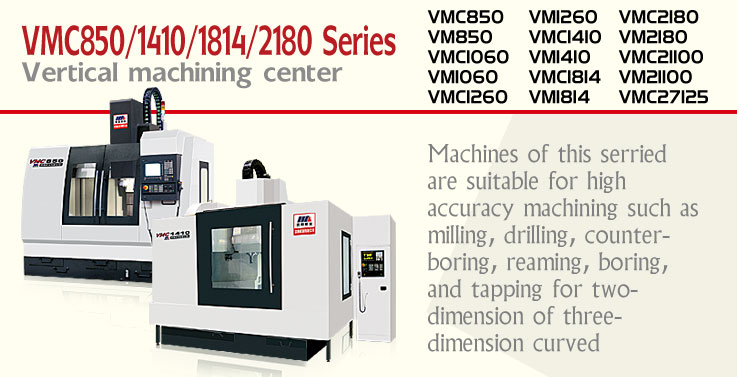 The guide-ways for CNC vertical machining center series adopt cast iron with hardening process to provide high rigidity and long service-time. Main motion of large-scale CNC vertical machining center is driven by gears transmission system via tow-step speed change to provide the spindle with increased speed range and large torque, suitable for power cutting. The bearings of spindle adopt imported bearings with characteristics of high speed and good rigidity. The bed is supplied with cooling cycle unit to control spindle temperature, and the machine bed is provided with four guide-ways to obtain high rigidity for the whole machine set. Machines of this serried are suitable for high accuracy machining such as milling, drilling, counter-boring, reaming, boring, and tapping for two-dimension of three-dimension curved and sloping surfaces.