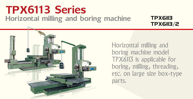 Horizontal milling and boring machine model TPX6113 is applicable for boring, milling, threading, etc. on large size box-type parts.